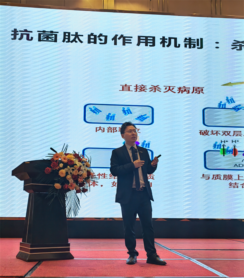 中農穎泰集團副總經理劉揚科博士出席會議,并做題為國家新飼添-枯草三十七肽的精彩報告,劉博士首先介紹了枯草三十七肽的研究歷程,及國家新飼添的申報歷程,集團數十年專注于抗菌肽的艱苦研發,終于獲得國家首個抗菌肽新飼添證書,開創了抗菌肽應用研發新紀元!劉博士詳細闡述了抗菌肽的作用機制、現場應用效果。在水產上,抗菌肽具有促進生長、修復腸道、提高免疫力增加成活率等作用,中農穎泰抗菌肽水產飼料產品成分明確、安全合法可檢測、效果顯著廣泛使用。